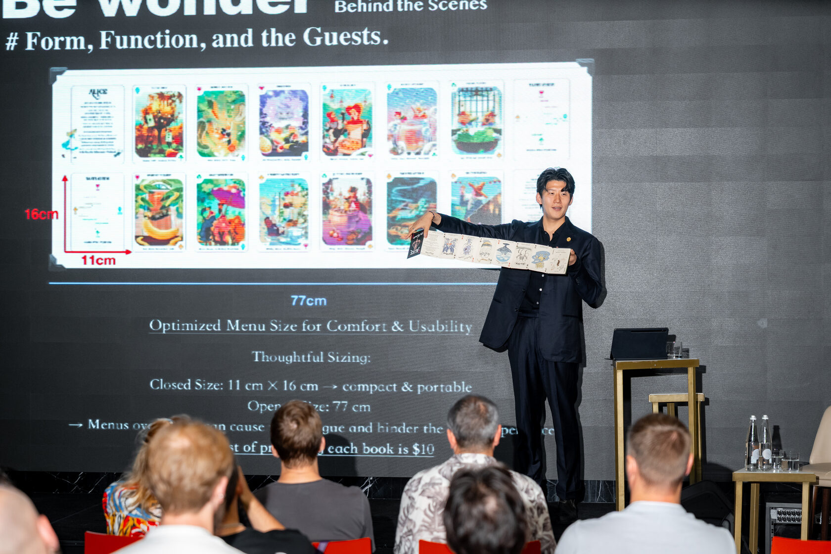«Меню — это наше оружие», — с этой фразы началось выступление. Команда Alice воспринимает коктейльную карту не как перечень позиций, а как полноценный медиум, который формирует ожидания гостя, управляет вниманием и даже мотивирует возвращаться снова. Меню Alice — это карточная «книга-раскладушка» длиной 77 см, удобно раскрывающаяся двумя руками. Страницы идут от A до K, джокер раскрывает состав коктейля, а последняя карточка содержит обращение к гостю и просьбу вернуть стоимость в случае кражи.
